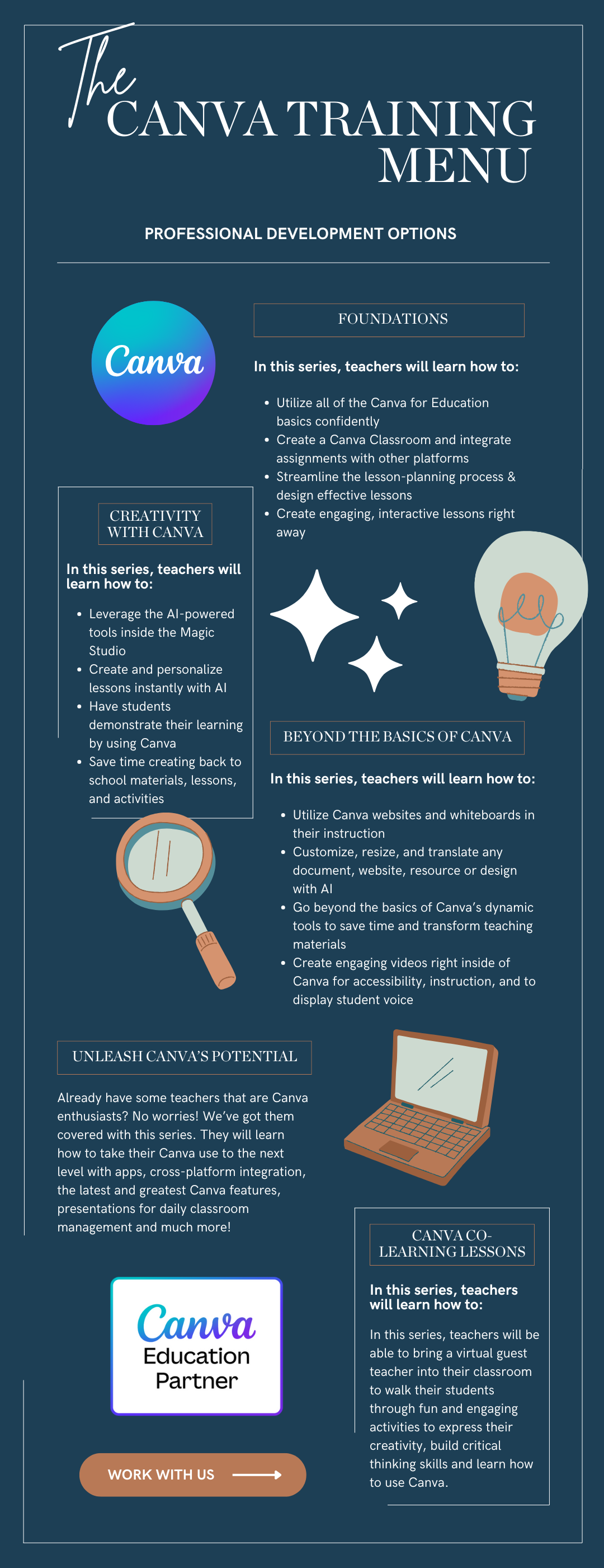 Whether you have a full day of PD or a few hours, we will come to your school with our engaging and hands-on Canva trainings.